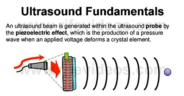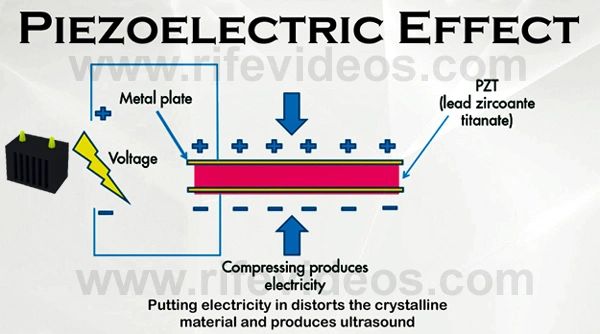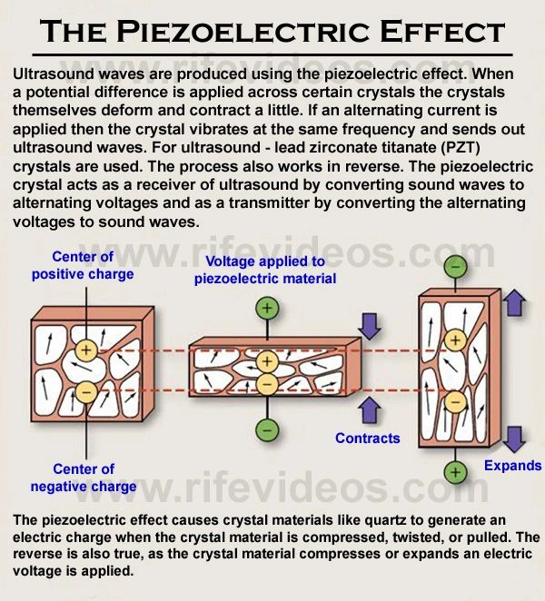 This diagram of the piezoelectric effect shows the expanding and contracting effect. Notice in the diagram the crystals have a positive and negative side where the wires should be connected. Alternating Current or AC is basically like DC or Direct Current except the positive and negative is switched back and forth from positive to negative and this creates the ultrasound frequency waves. A piezoelectric crystal can also produce electricity and this is referred to as "Piezoelectricity."