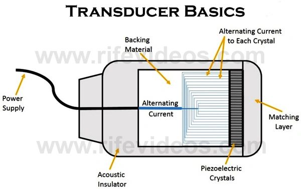 If you watched the videos then you have a better understanding of how piezoelectric crystals produce electrical current or ultrasound frequencies. This diagram is of an ultrasound transducer or probe that has multiple crystals in it like the Crystal filled hand-electrodes do, but the ultrasound transducer has electrical wire connections on each side of all the crystals so the voltage can be put into them on the positive and negative side of the crystals. Alternating current is used so the crystals will be stressed back and forth in two different directions over and over again and this creates ultrasound frequencies.